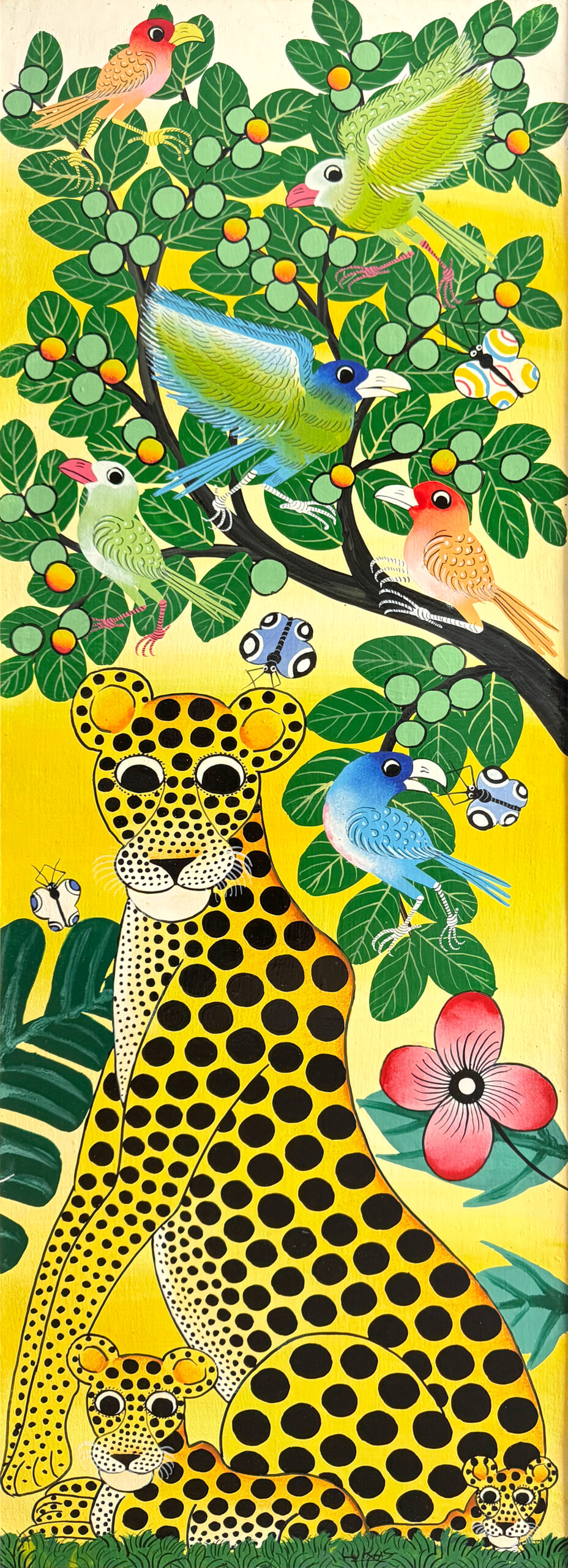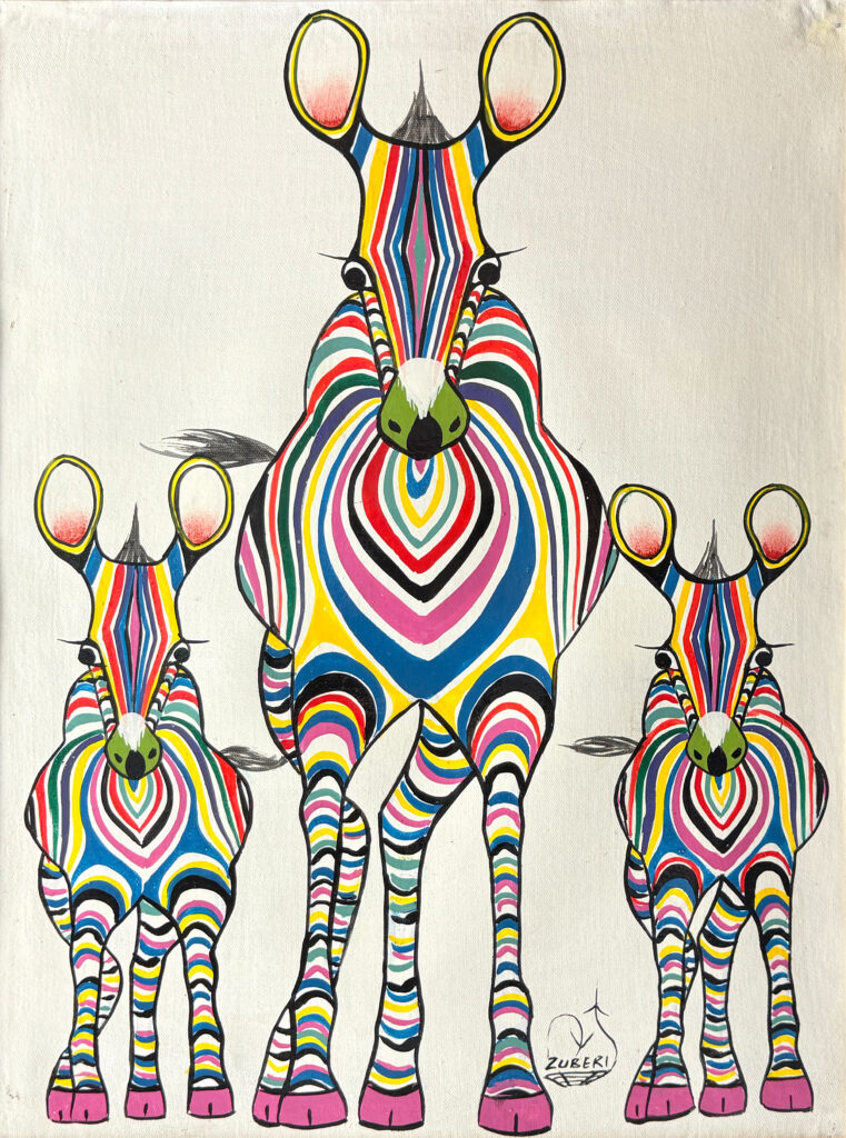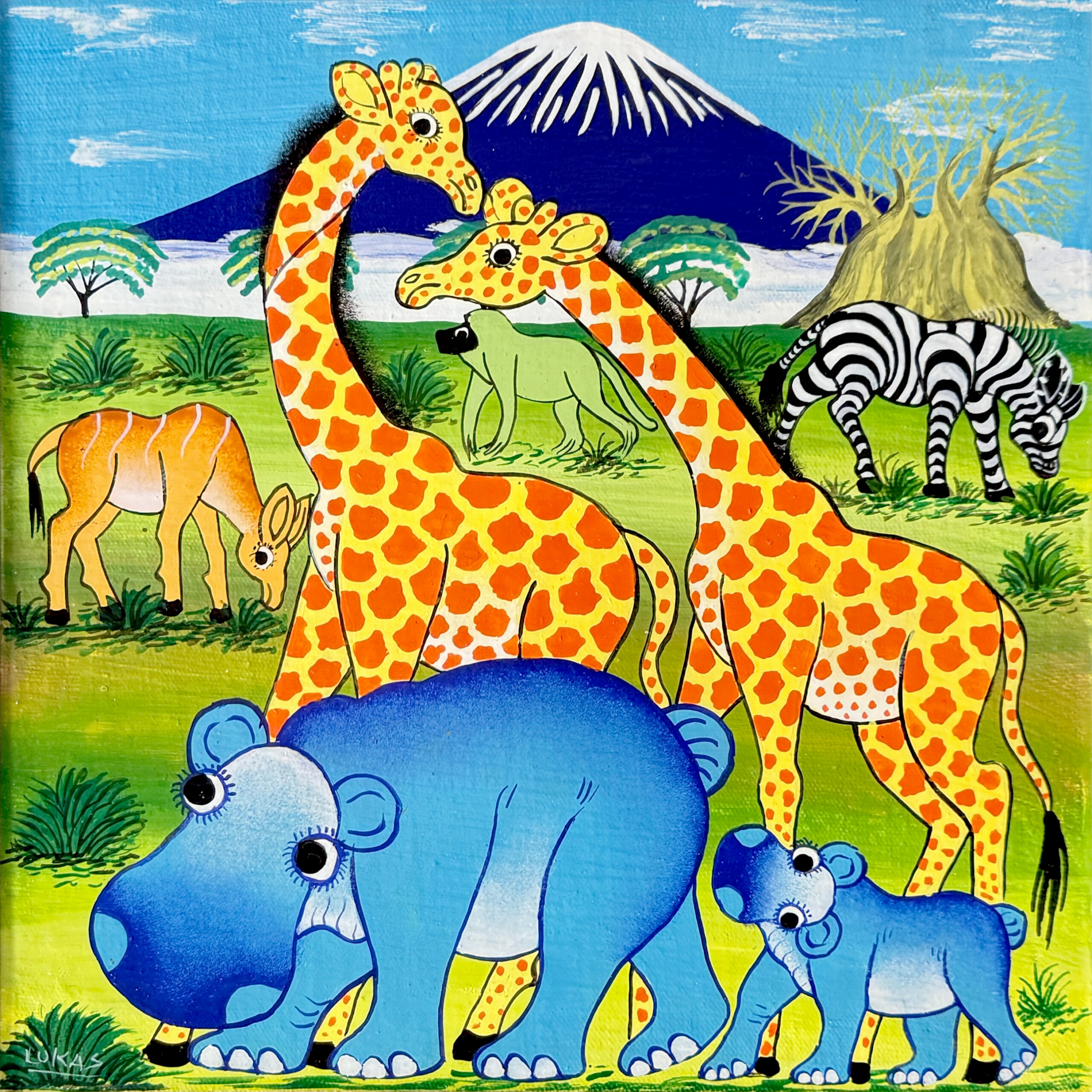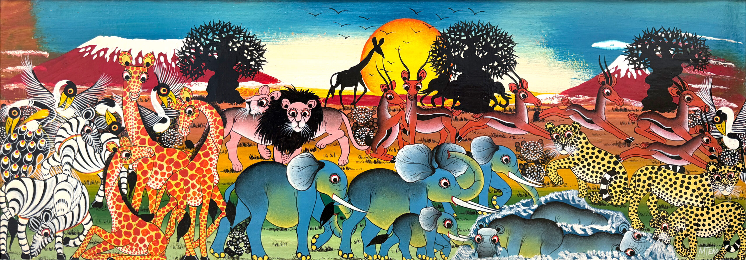 ティンガティンガ・アートとは、1968年にタンザニアにおいて、E.S.ティンガティンガ氏とその弟子たちが、6色のエナメルペンキを用いて、自国の豊かな自然、動物や鳥、人々の暮らしを、色鮮やかに描き出した絵画のスタイル。