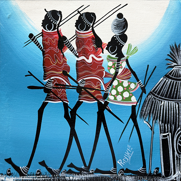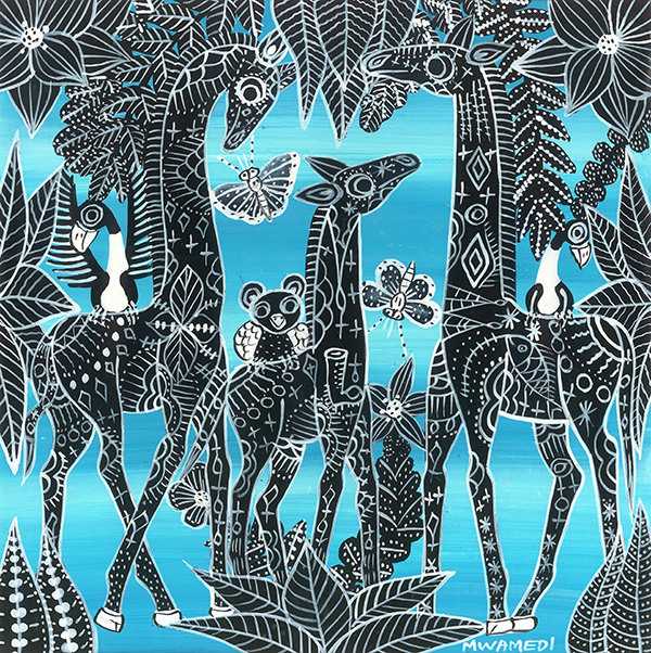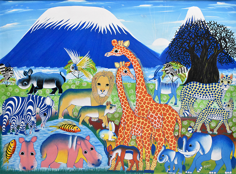 キャンバスいっぱいに、タンザニアの植物(主に出身地のキリマンジャロ地方の植物や花)を描く独特の作風で人気を博したデビッド・ムズグノ氏(1951-2010)の作風を受け継いだ、ムズグノブラザースのうちの一人、長男 ムシャーナ・ムズグノの息子。