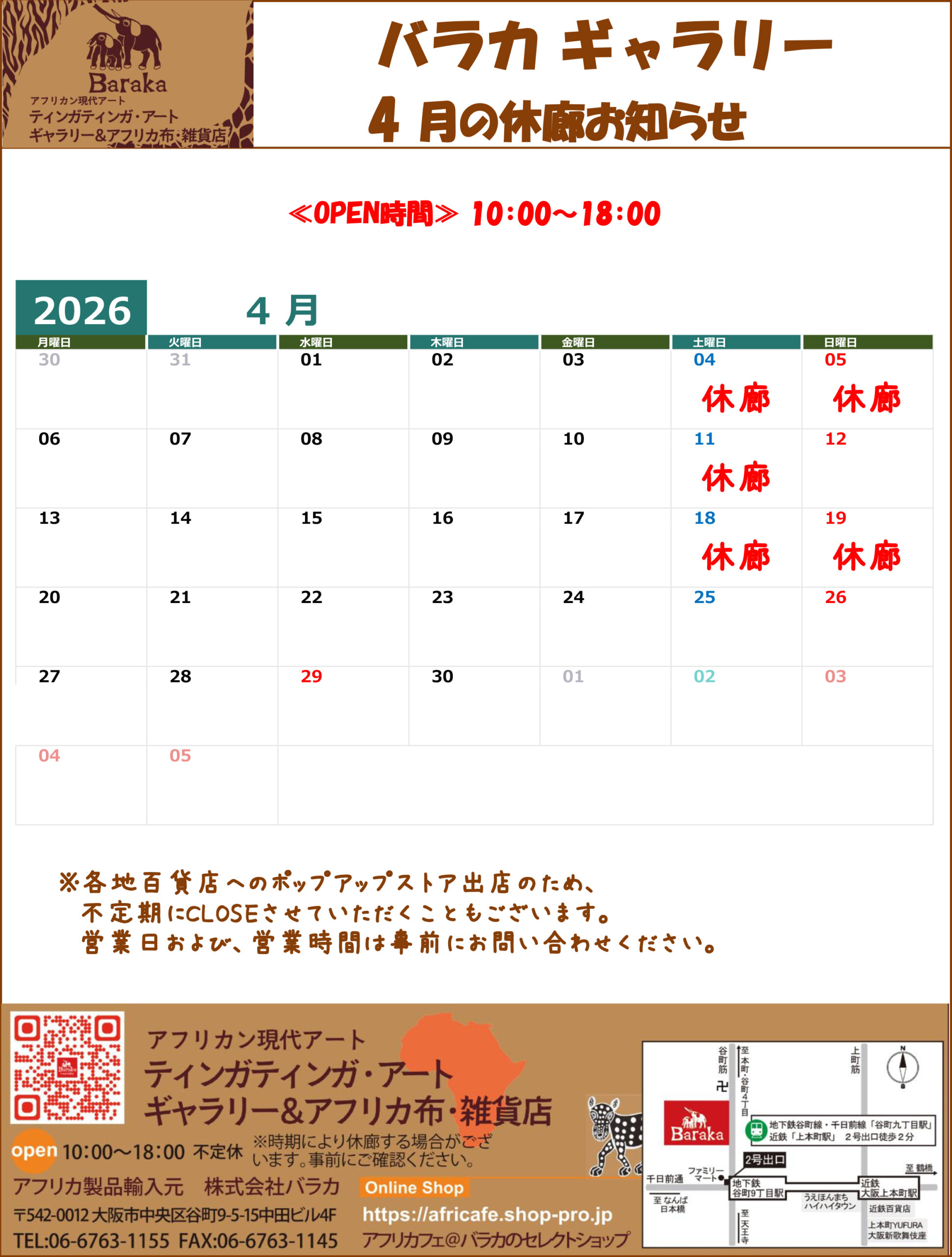 * * * 2026年4月の営業 * * *