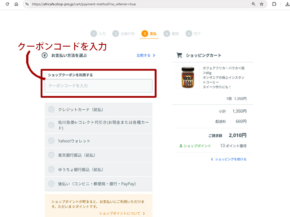 お買いものカートお支払画面で、【ショップクーポン入力】欄に、≪クーポンコード≫を入力してください。