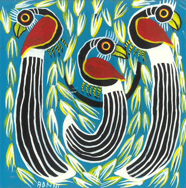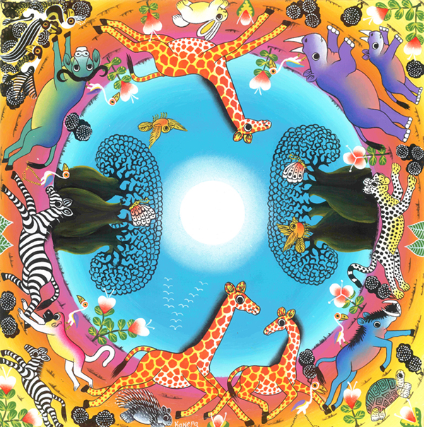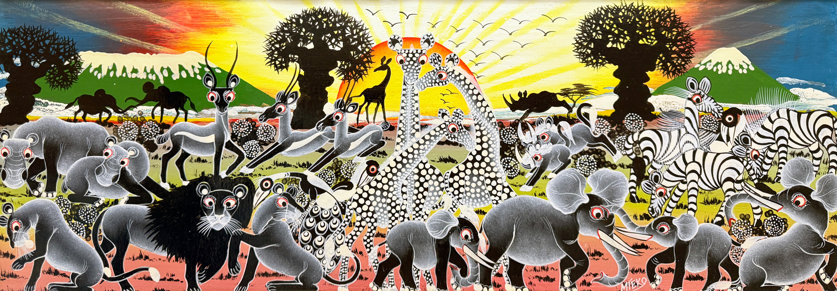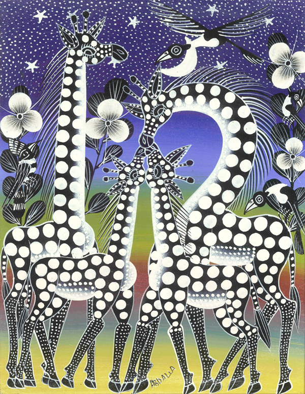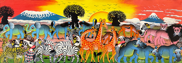 ティンガティンガ・アートとは、1968年にタンザニアにおいて、E.S.ティンガティンガ氏とその弟子たちが、6色のエナメルペンキを用いて、自国の豊かな自然、動物や鳥、人々の暮らしを、色鮮やかに描き出した絵画のスタイル。