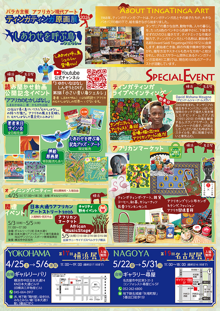 今年も、日本大通り沿いにあるギャルリーパリにて、2026年4月25日(土)~5月6日(水)まで バラカ主催ティンガティンガ原画展 第17回横浜展~しあわせを呼ぶ鳥シェルレ~を開催しています!
