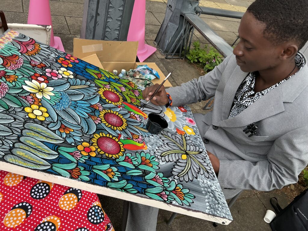 来日アーティストのデビッド・ムズグノは、私たちの2週間ほど前に日本入りしたため、その時期はカタール航空が欠航中で、エチオピア航空のチケットを購入しなおしましたが、彼も無事到着して元気にライブペイントを制作中です。