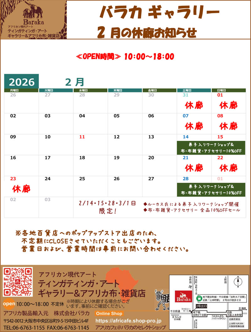 バラカ大阪本店ギャラリー&ショップ2026年2月の営業日お知らせ