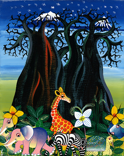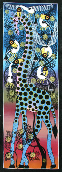 12歳で絵の修行を始めたが、体が小さく、兄弟子たちからDOGO(チビ)と呼ばれたのが、そのままティンガティンガ村でのニックネームになったので、サインもそれにしたとさわやかに笑う。 (DOGOとは、小さいという意味のスワヒリ語)