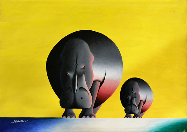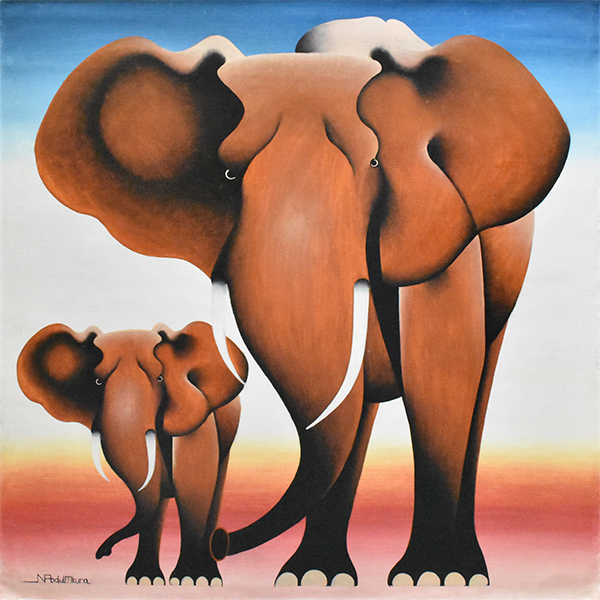 以来、日本だけでなく、欧州でも評価が高い、ムクラの描く闇夜に浮かぶ象、サイなど迫力ある動物画の画風を受け継ぎ、将来はこの画風をさらに